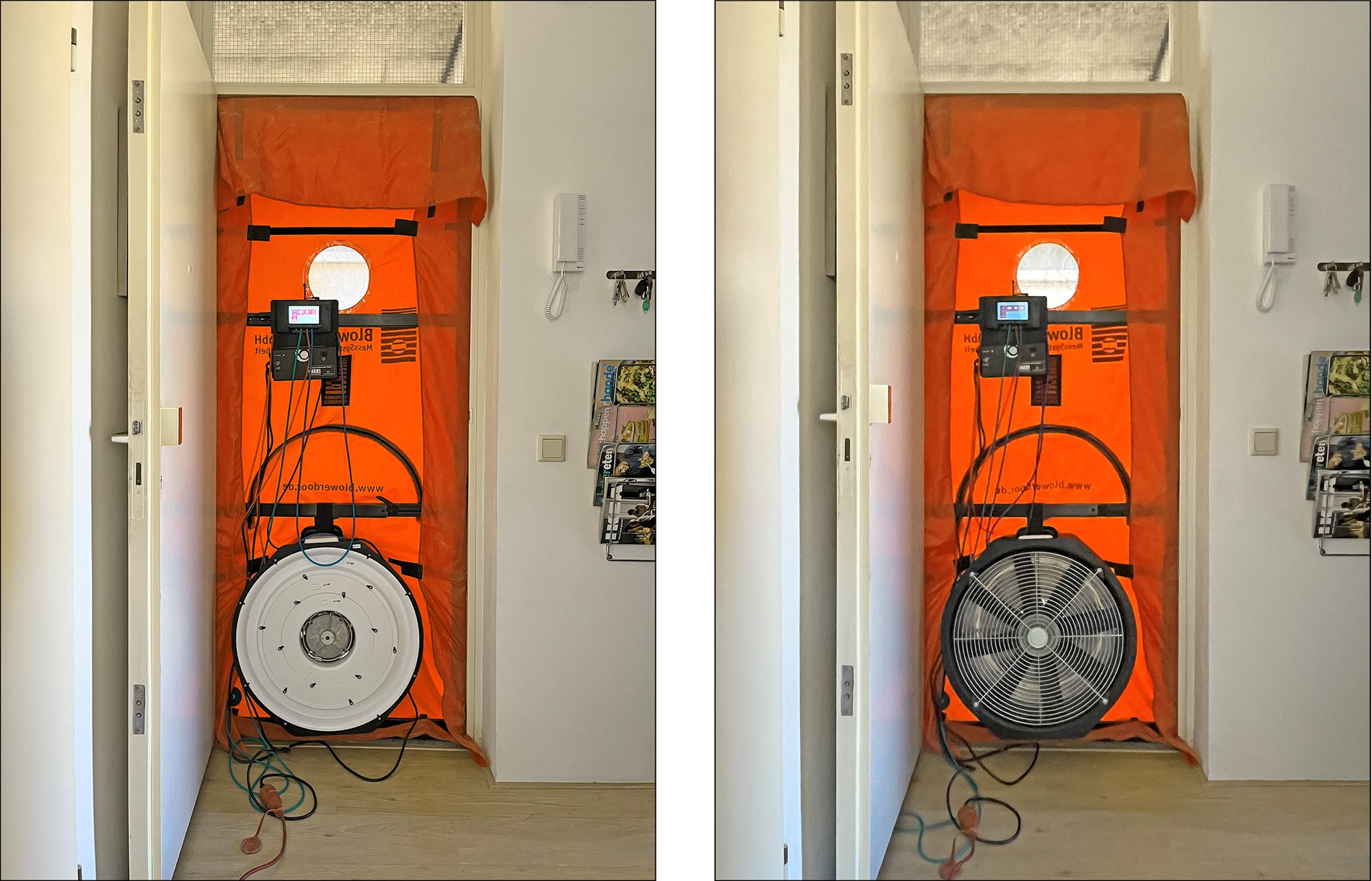 Onderzoek naar luchtlekken. Alle ventilatie-openingen worden afgeplakt, de meetapparatuur aangezet. De ventilator op de linkerfoto zuigt alle lucht uit m’n woning. Ik hoor een flink bromgeluid. Op de laptop volgt de onderzoeker het proces en wordt de uitslag van de onderdruk zichtbaar in een grafiek.