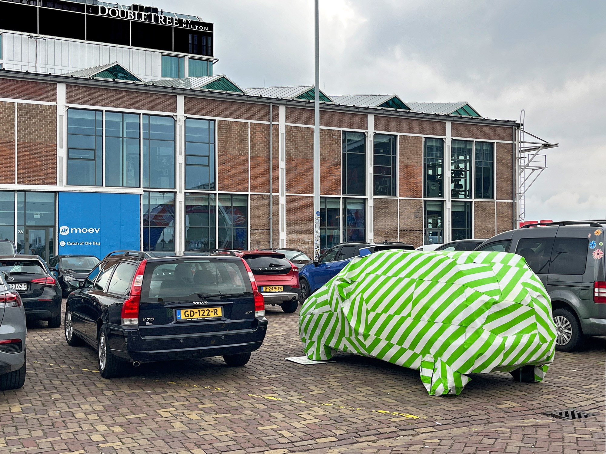 Als ik er dichterbij kom, vallen me pas de popnagels op. De papierstroken blijken geverfde aluminium platen! Dit kado is blijvend. Bijna realistisch, maar toch niet; een vervreemdend kunstproject. Zou er wel echt een auto in zitten?
