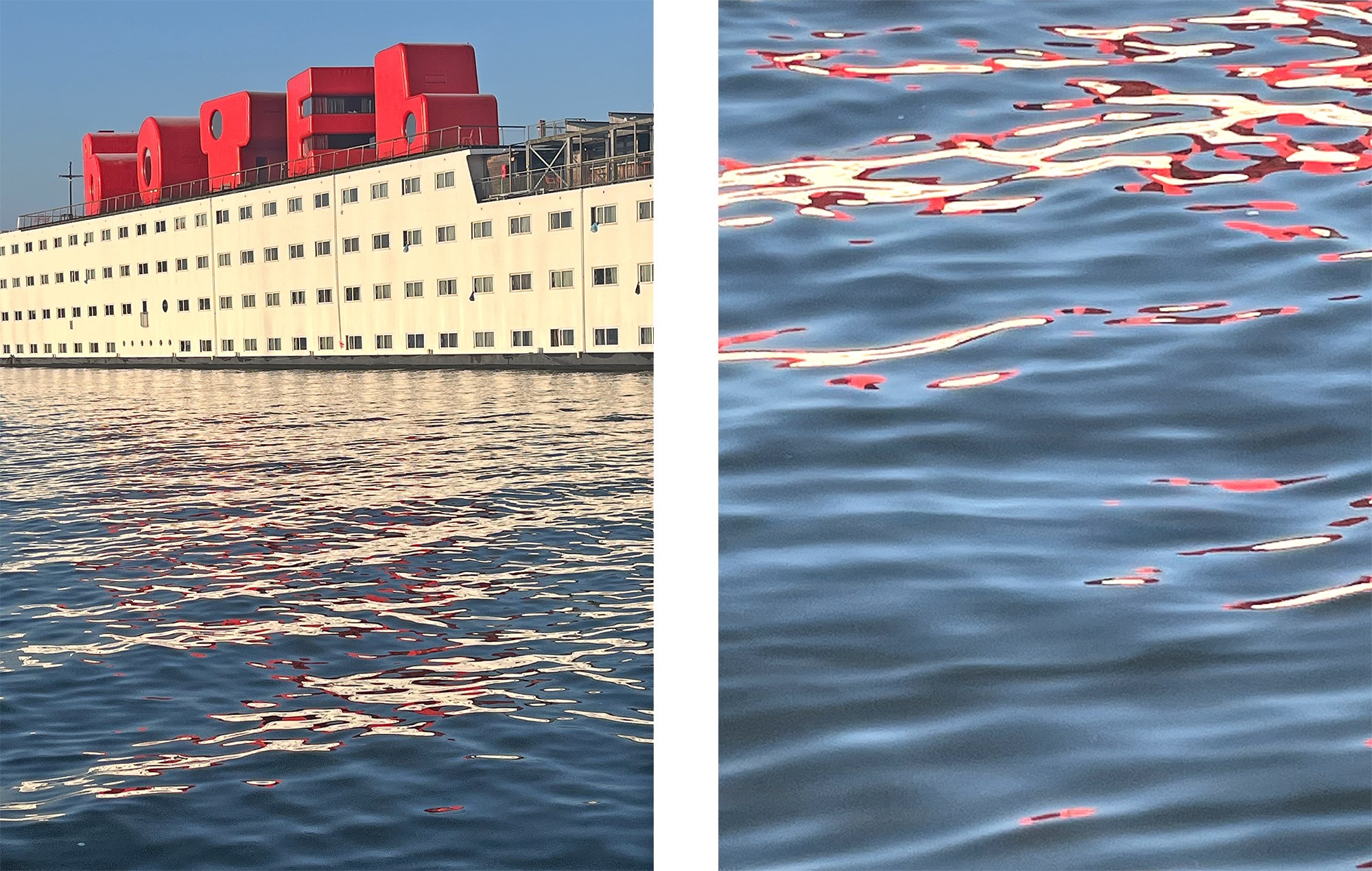 Gek, hoe je dan ineens het water weer echt ziet, een beeld waarbij het ‘Botel’ door een versnipperaar lijkt gehaald, en rode en witte sliertjes op het water drijven. Een zuchtje wind brengt een rimpeling in het water, waardoor je rood-witte banen krijgt. Golven kunnen de boot maar aan één kant weerspiegelen.