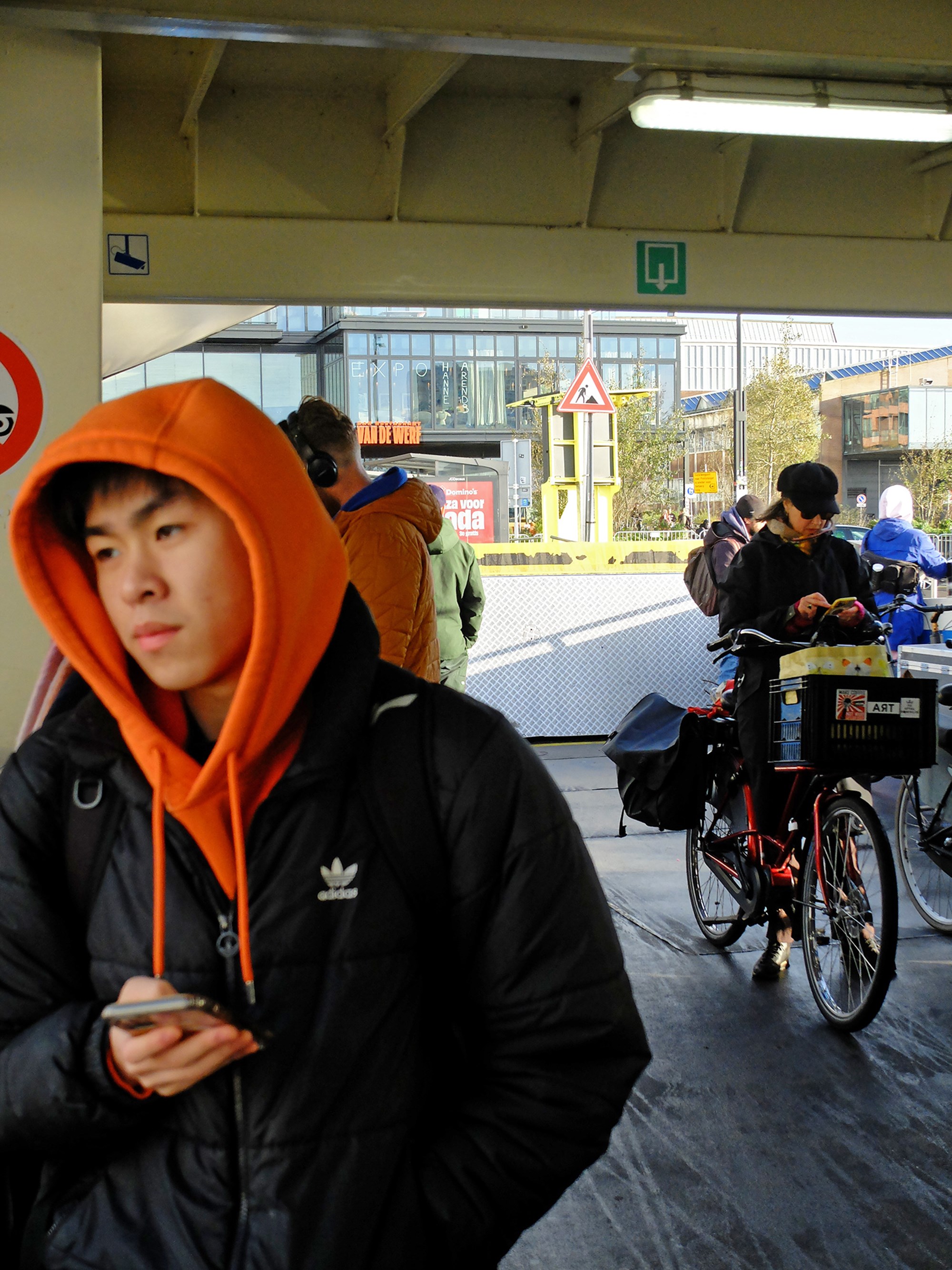 De Japanse jongen met de oranje hoodie vind ik mooi. De onscherpte werkt verzachtend. Die stralende oranje kap schermt hem af en domineert de foto, wordt een vorm op zich. Hij zit in zijn hoofd, kijkt naar binnen. Waar zou hij aan denken? Of staart hij leeg in ‘t niets? Verveeld vind ik zijn blik zeker niet. Eerder ontspannen, begrijpend. Z’n hoofd neigt opzij. Mijmert hij soms over iets wat hij net op z’n mobiel heeft gezien? Zijn lippen lijken het oranje te reflecteren. Hij houdt voor mij iets mysterieus.