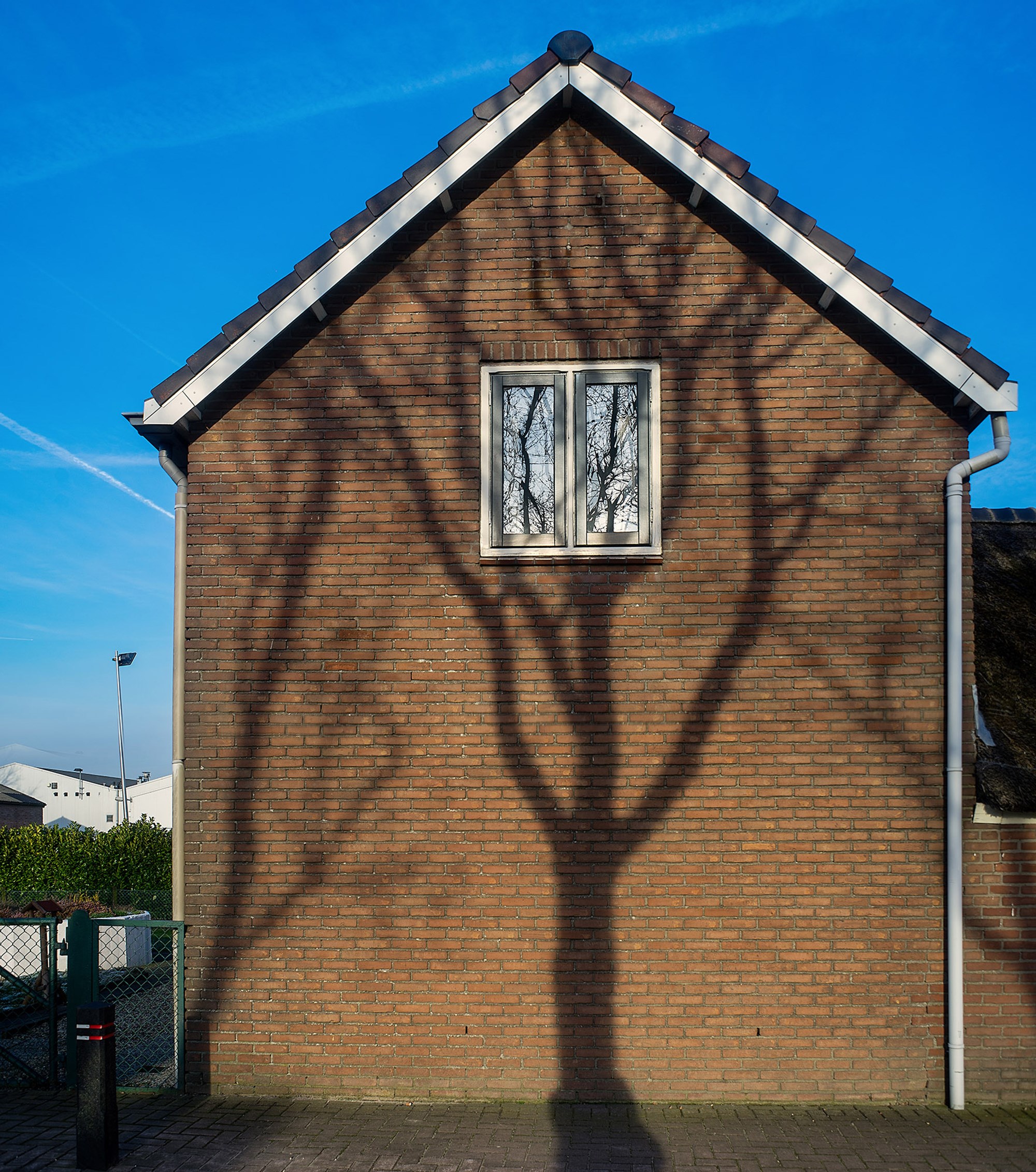 Een huis, jouw thuis. Met de hond in zijn mand. Koud buiten. Lekker binnen, kachel aan. De kale boom stuurt zijn schaduw naar het huis. Zijn transparante takken dragen nu het dak. Hij ziet zichzelf in de ‘spiegel’ terwijl z’n schaduw op de muur verschuift.