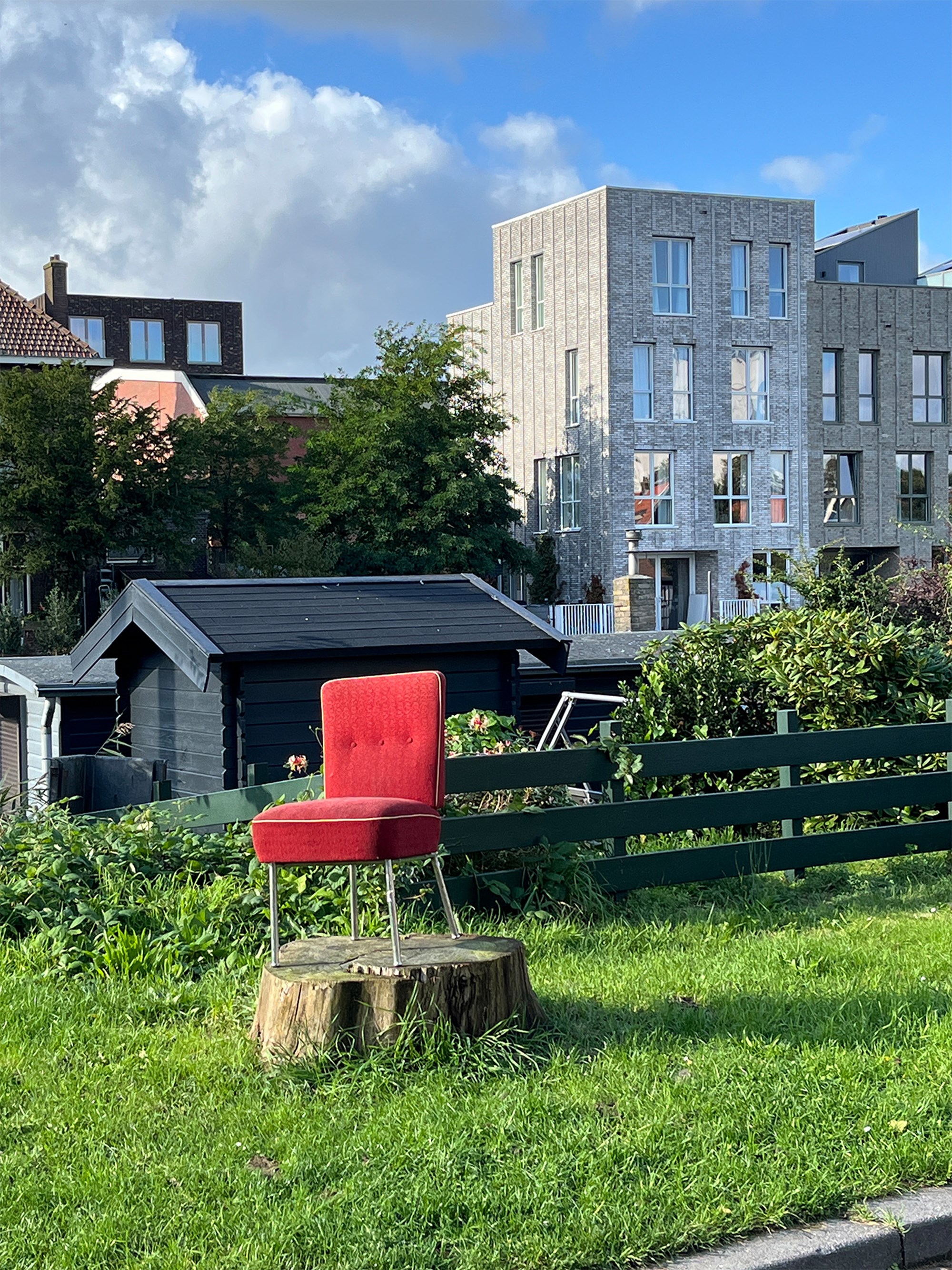 Bij de Wasknijperbrug in Noord zag ik rechts bij de woonboten, een rode stoel in het groen. Voelde uitnodigend en was al ingezeten zo te zien.