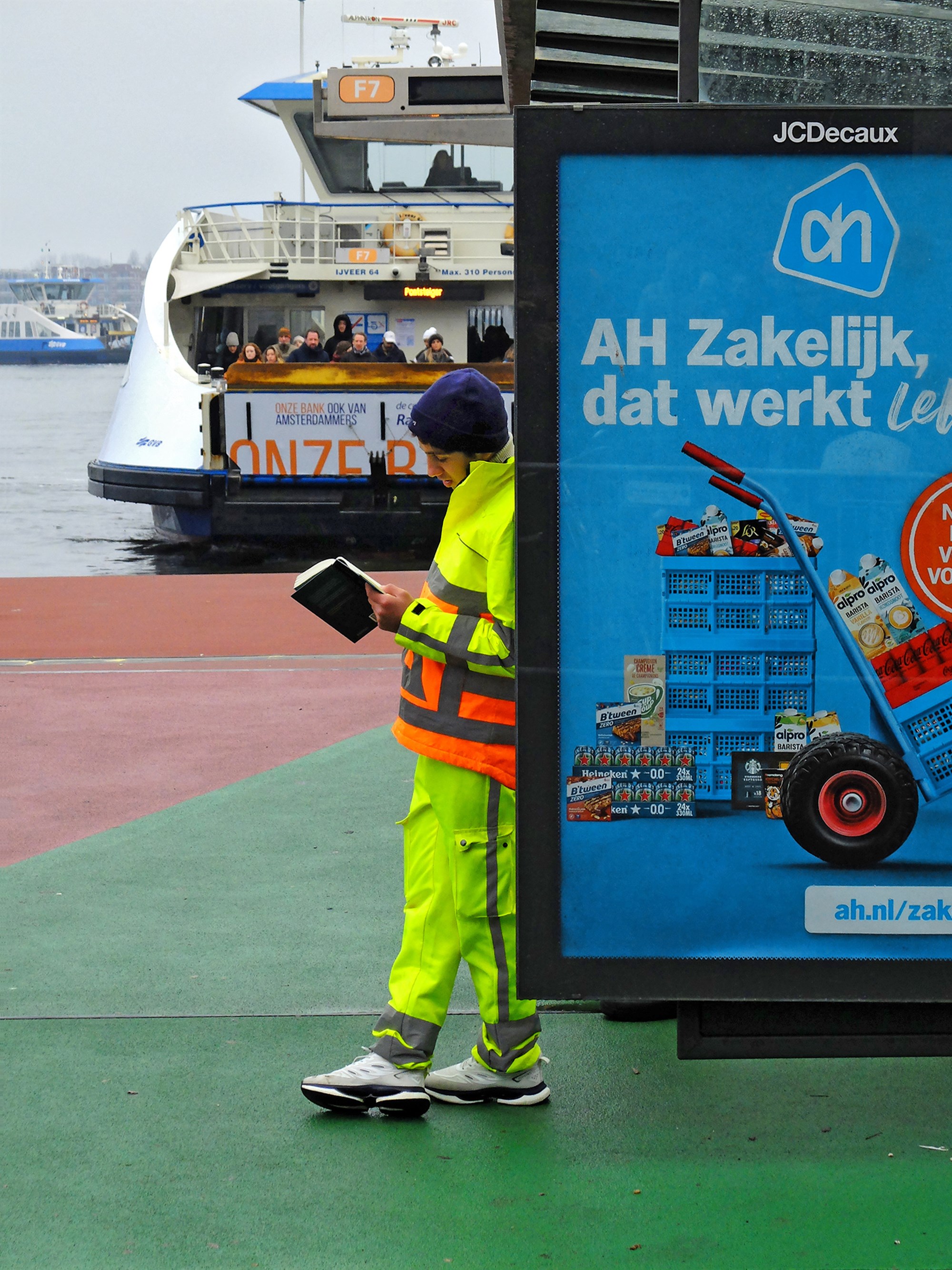 Twee pontwachters houden orde. Ze helpen mensen die in het verkeerde vak staan. Ze slepen de hekken van de pontvakken open en dicht. En wachten weer. In kou, wind en regen, pittig werk, maar met mooie fluoriserende pakken. Met zon lichten de strepen op.
