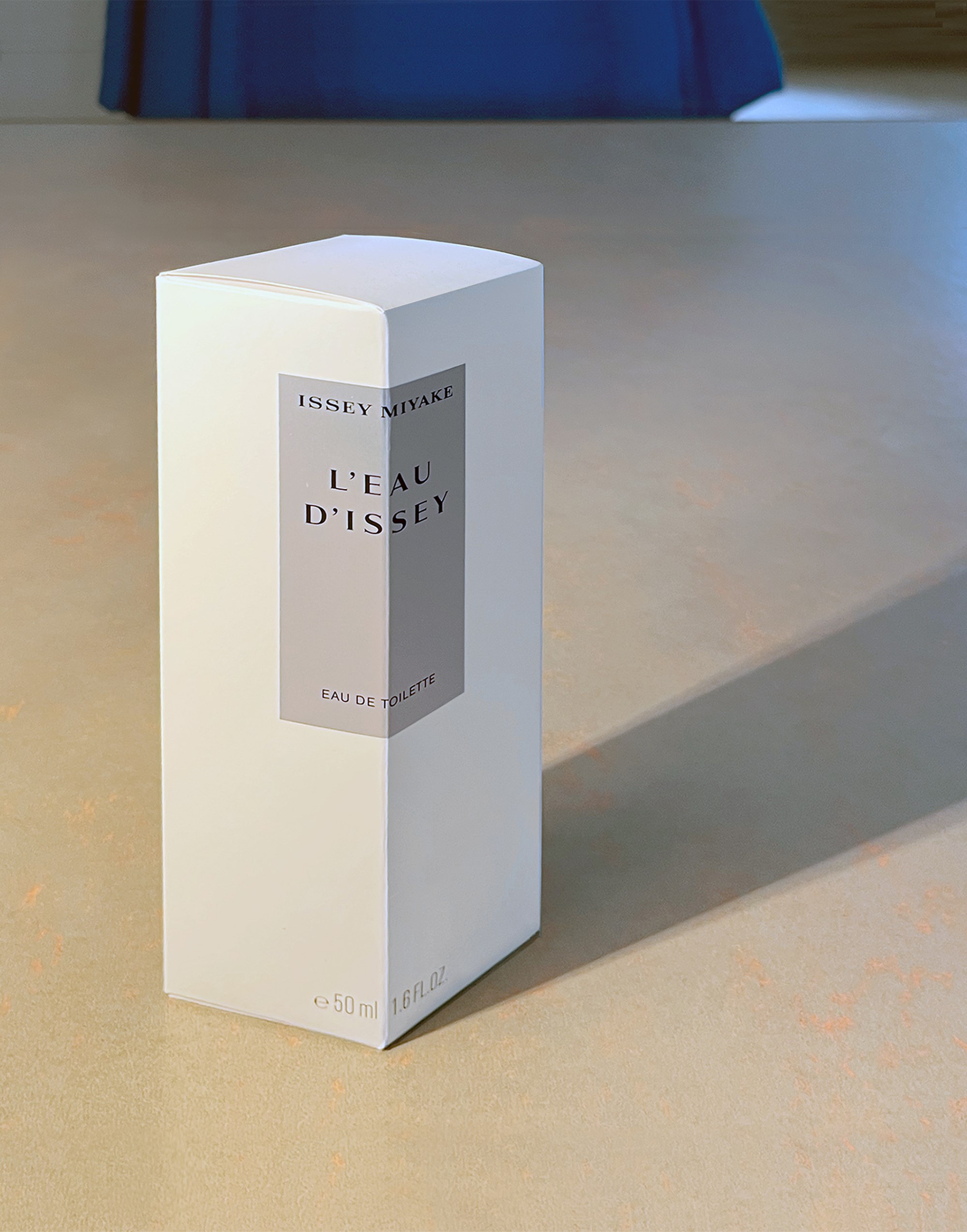 Het lijkt op de foto een simpel doosje. Maar als het reukwater ‘L’eau d’Issey’ heet, moet het wel bijzonder zijn. Issey Miyake, de Japanse modeontwerper met een zeer eigen visie op kleding, besloot in 1992 zijn eerste parfum onder zijn naam te laten maken voor Shiseido: hij wilde een geur van water. Dat leek onmogelijk, want waar ruikt water naar?