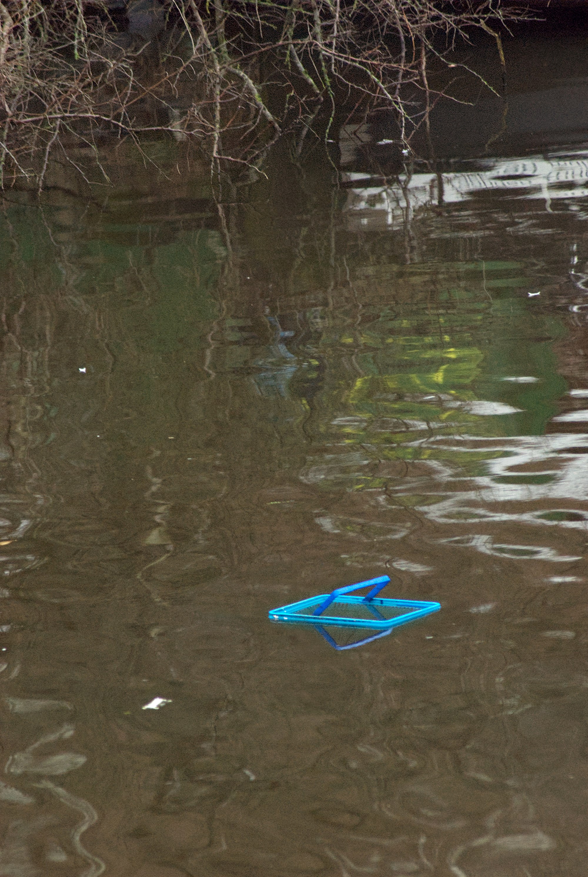 Iemand heeft geen boodschappentas bij zich en zet het volle mandje dan maar in de auto. Blijkt het later met mooi weer, handig voor een picknick bij het kanaal. Waar het lege mandje wordt vergeten. Kreeg het van een hond die achter een bal aanrende een tikje en belandde het toen in het water?