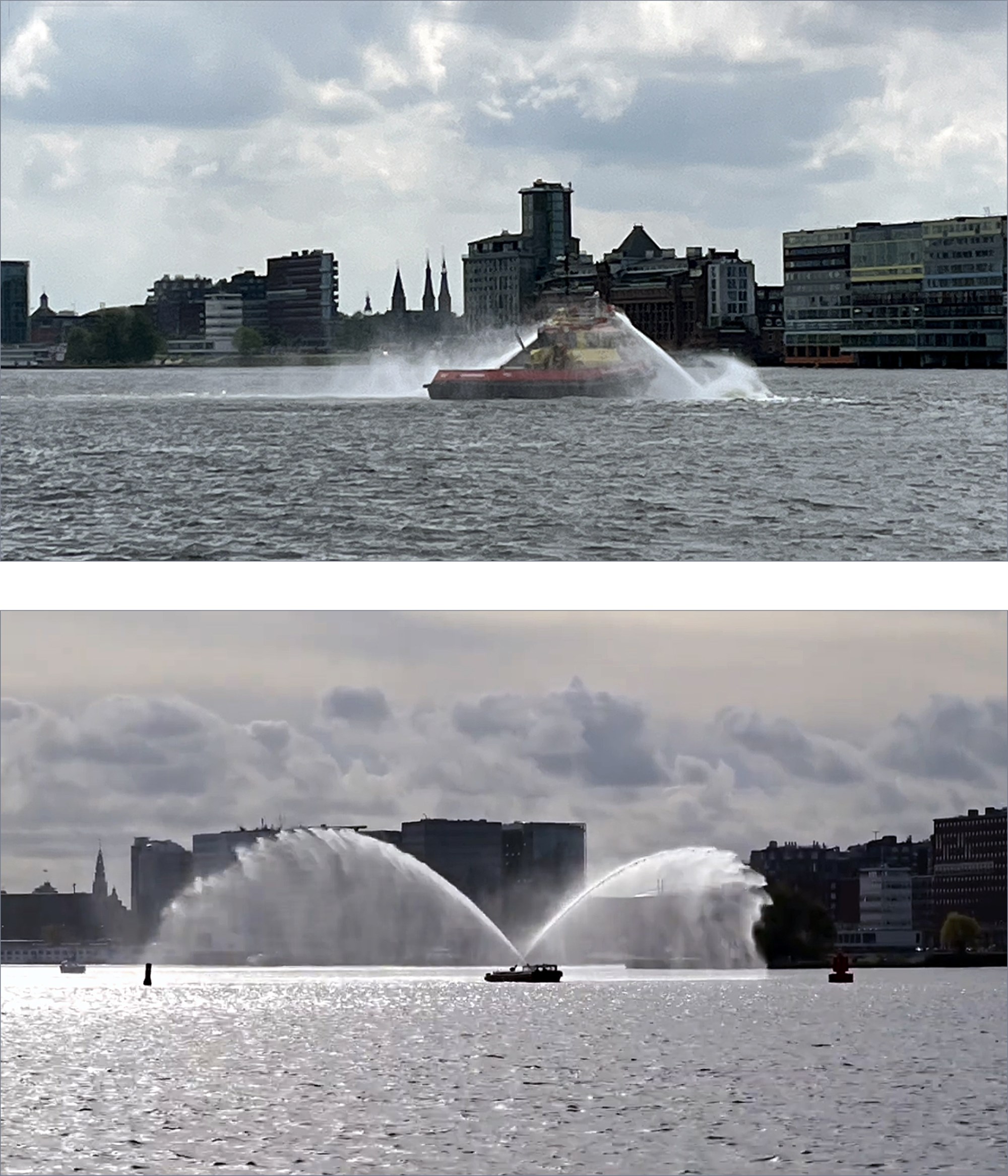 Even imponeren, laten zien wat je kan. Wat een power en bereik. De krachtige spuiten creëren enorme watervleugels. Een mythische vogel op het IJ? Of, als in een sprookje ... de boot wordt opgetild, vaart niet meer, maar vlíegt over land verder.